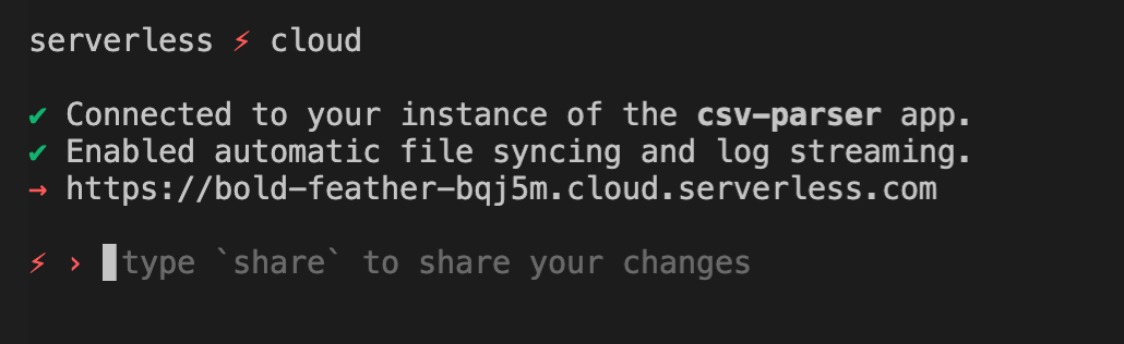 On your local machine, create a new directory called csv-parser, then open this new directory in any code editor you prefer. This directory will be the folder for your application files. Using your terminal, install the Serverless Cloud CLI if you haven’t already, and then run cloud within the csv-parser directory.