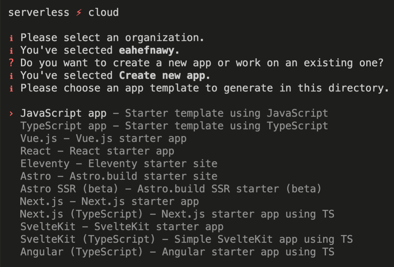 You may be prompted to login if you haven’t already, then the CLI will ask you to select a template to get started with. Choose the JavaScript app template.