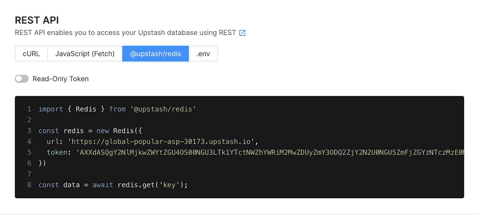 Then, get back to your database page in the Upstash Console, scroll down to the “Rest API” section, and click on the @upstash/redis tab to view the sample code.