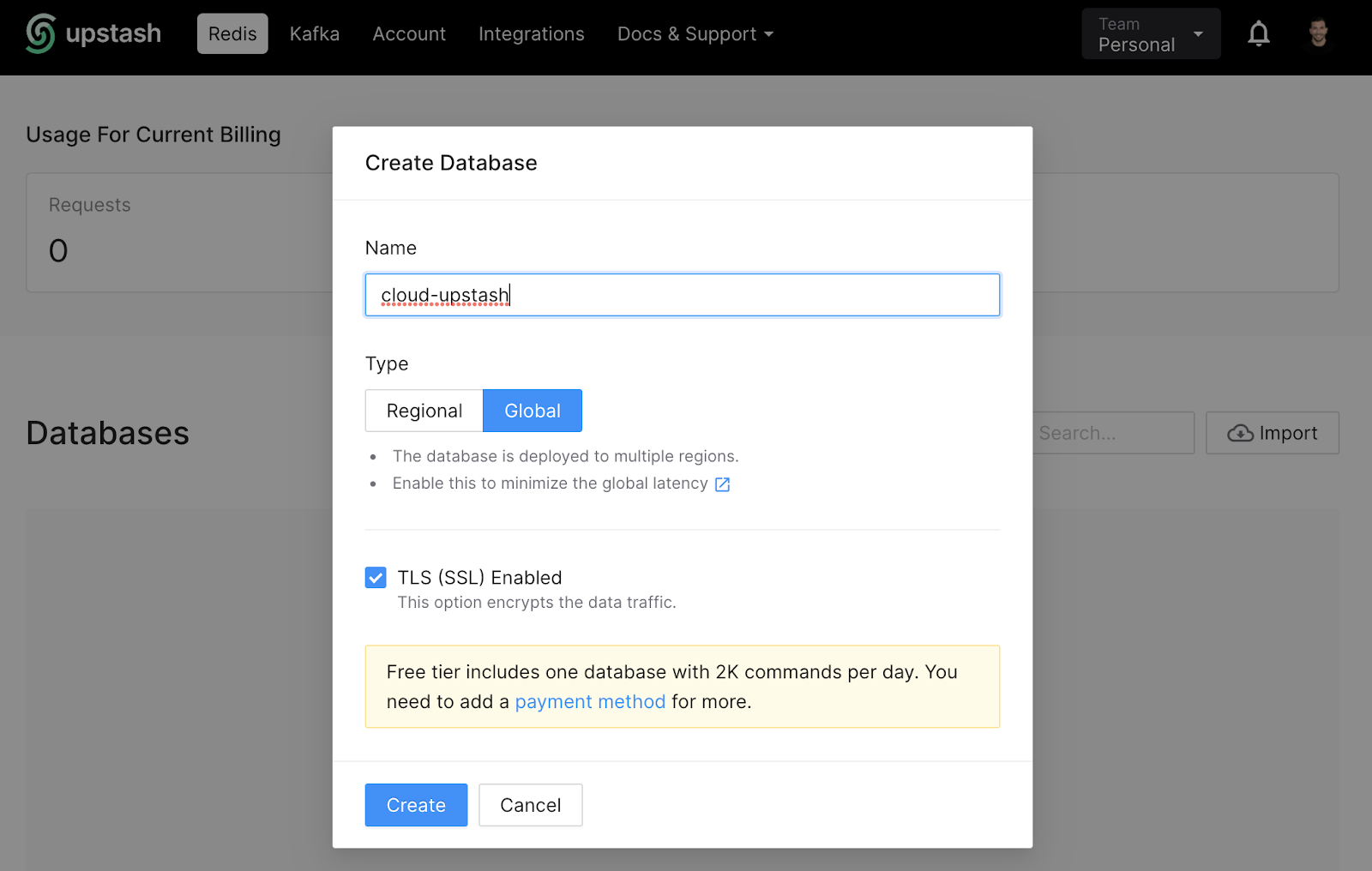 You’ll need to create a global Upstash Redis database with the Upstash Console. Just enter a name, choose “Global”, and enable TLS for a secure connection.