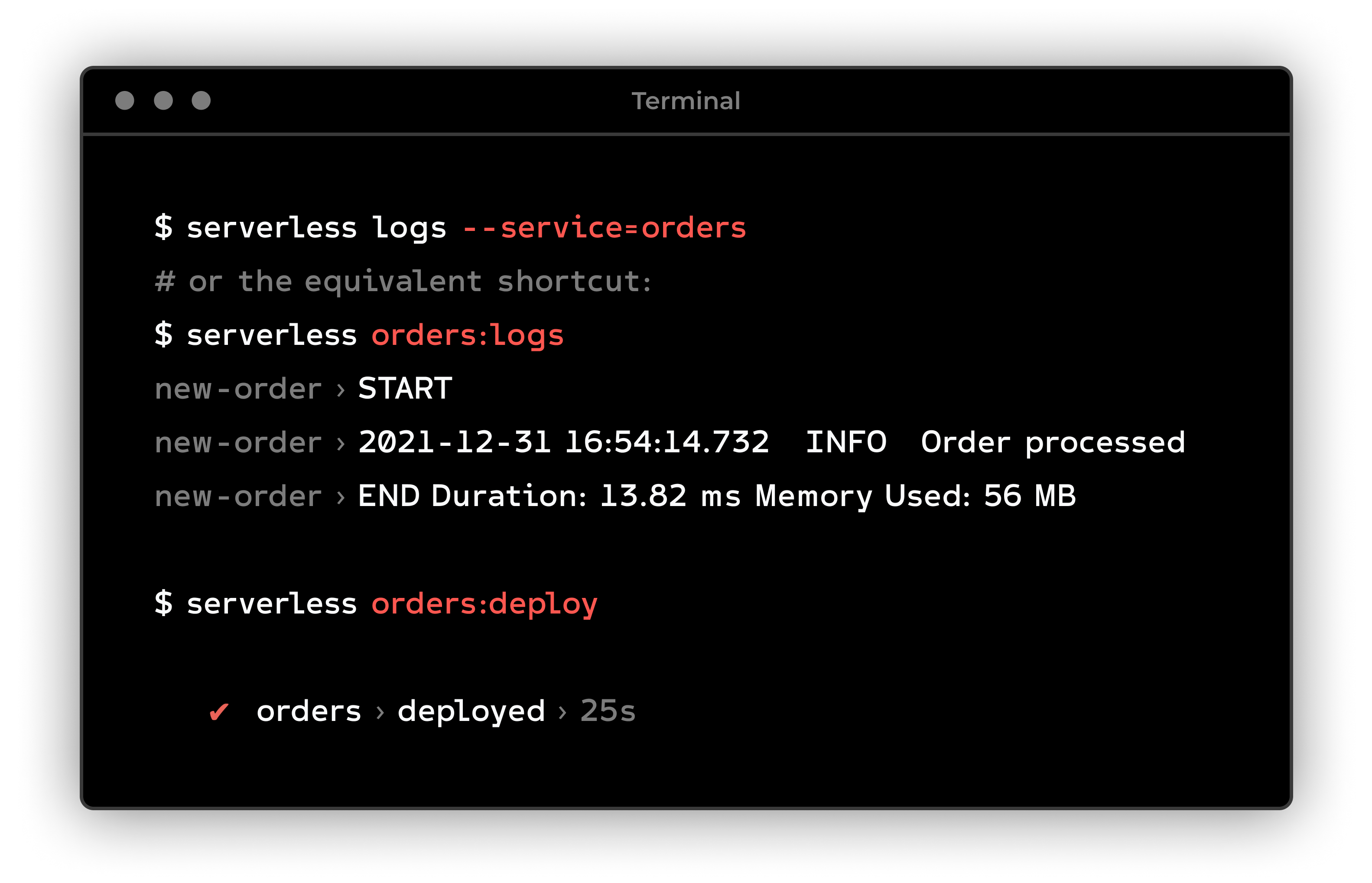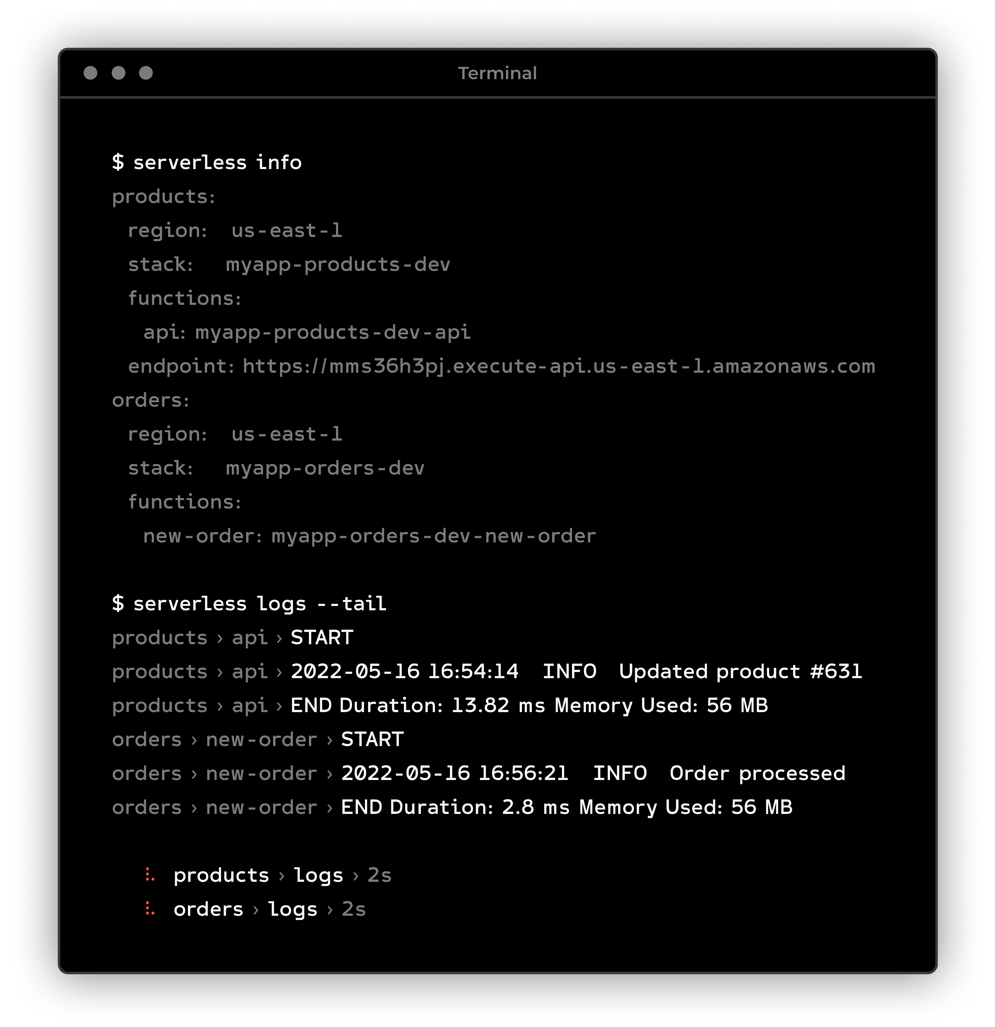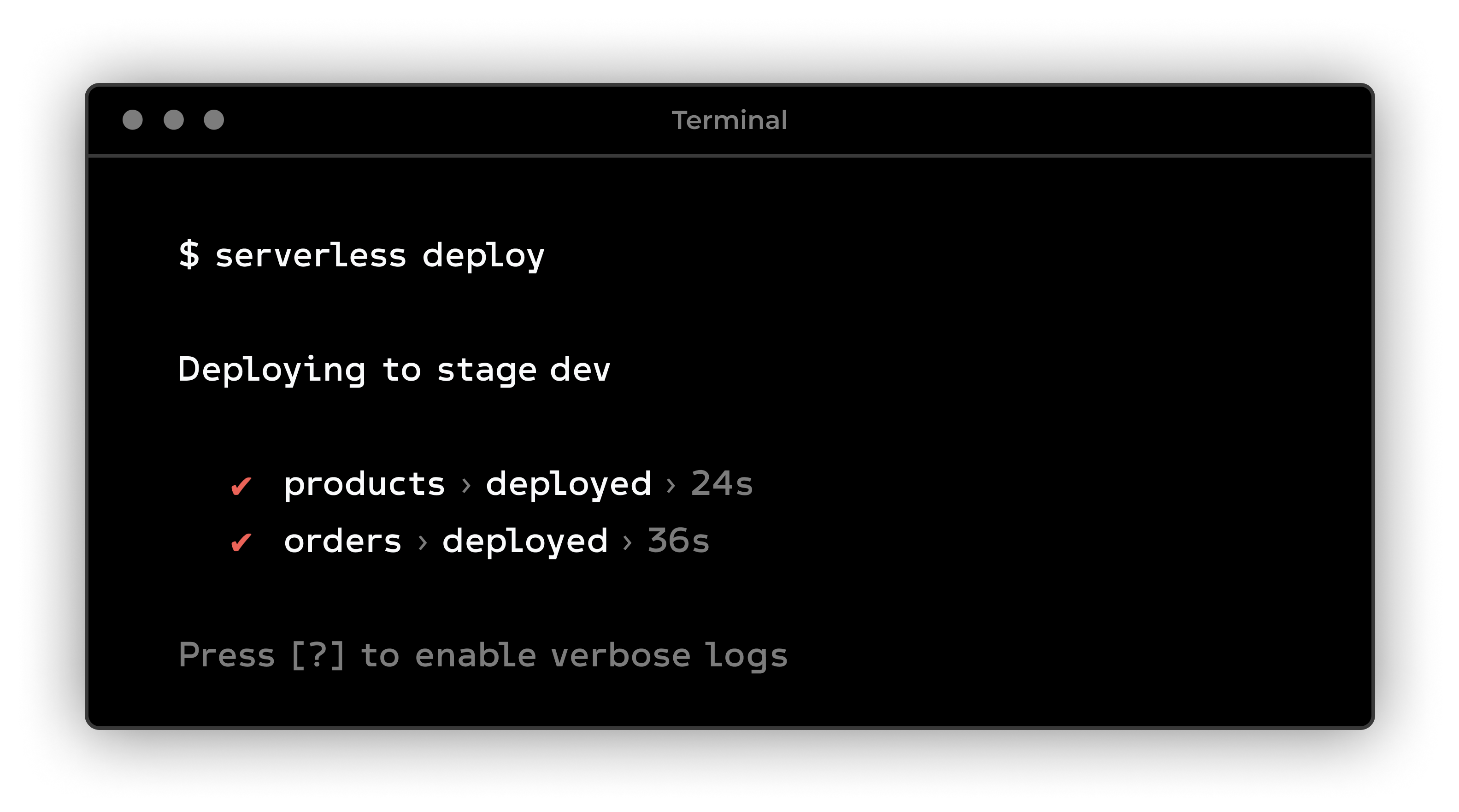As you can see above, each existing Serverless Framework service is referenced via a relative path. When running "serverless deploy" in the root directory, Compose will deploy both services ("products" and "orders") in parallel.