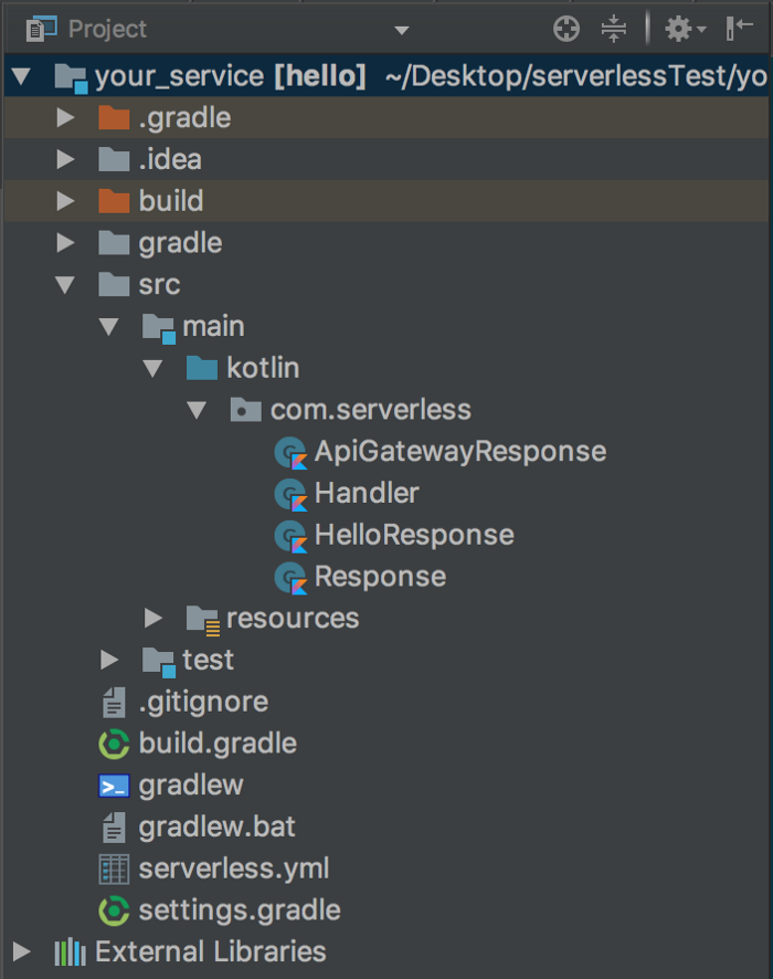 In the previous example, serverless will build an API Gateway with an endpoint /hello that will accept HTTP GET requests that call the main function in the Handler.kt file.