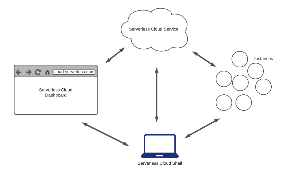 - The Serverless Cloud Service, which is the back-end service that the shell communicates with and does all the behind-the-scenes work of creating, updating, and managing your instances.