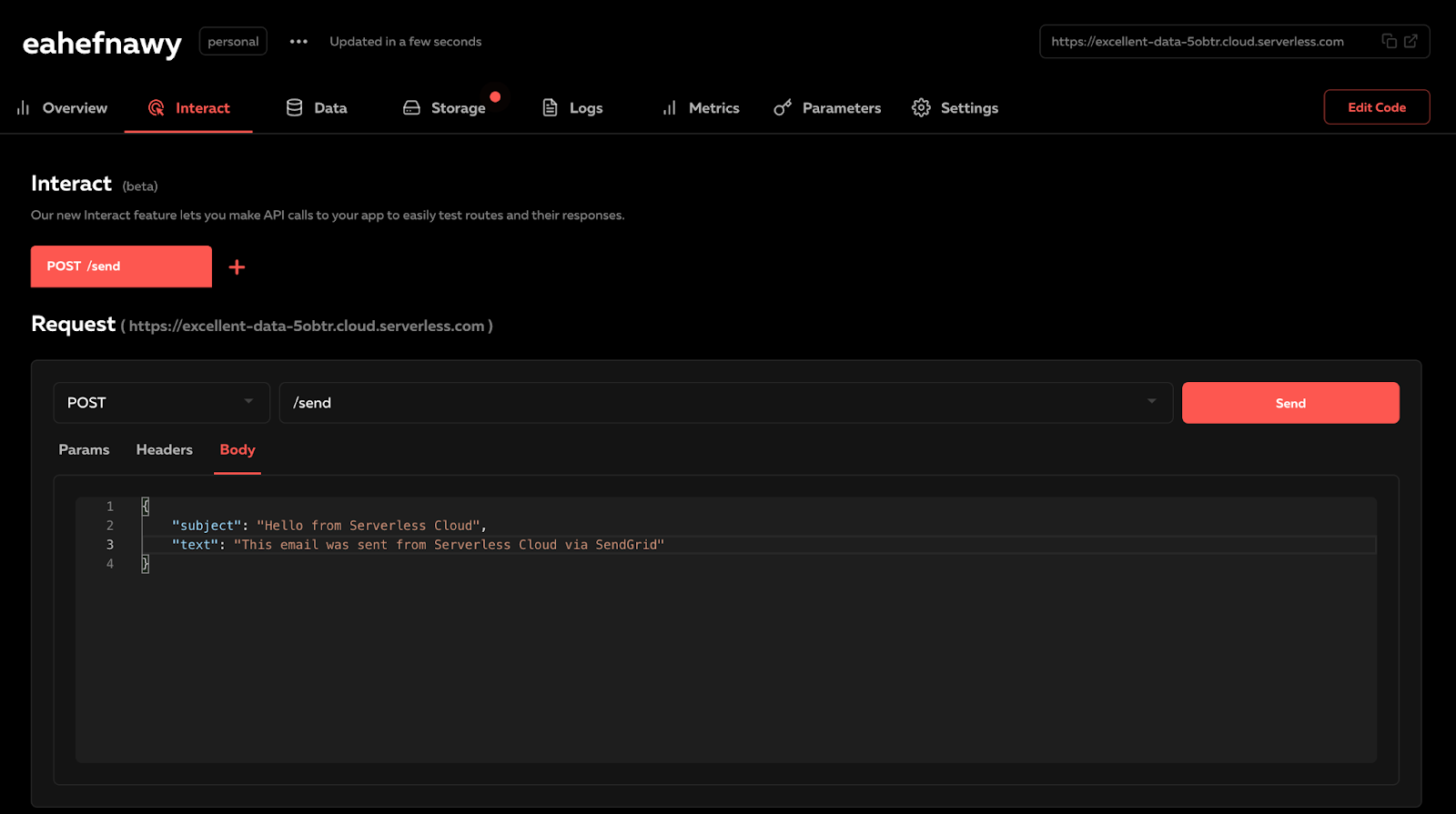 You can use the Serverless Cloud Interact feature to manually play around with your API and test your changes. To try it, run the "open" command in the interactive shell to open your app dashboard, and click on your personal sandbox instance that follows your username. Then, click on the “Interact” tab.