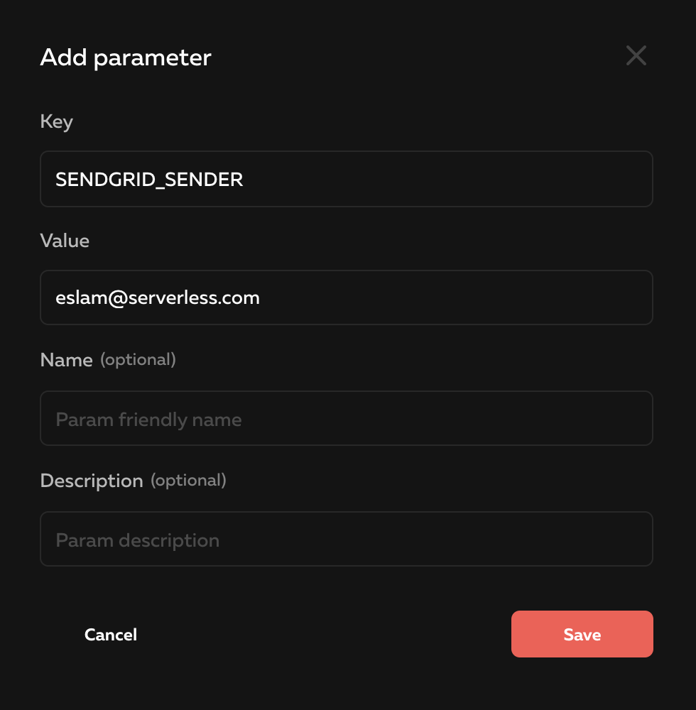 Once you’re done with both of these things, you need to save the API key and the sender email address you verified as Parameters on Serverless Cloud Dashboard to securely access them in code. To do that, type "open" in the cloud shell to open your app dashboard page on the browser, then click on “Parameters” > “Add new param”. Name your param SENDGRID_API_KEY and add the API Key in the “Value” field, and another one for SENDGRID_SENDER. You can see below how that might look like. Remember, you’ll need to add two parameters.