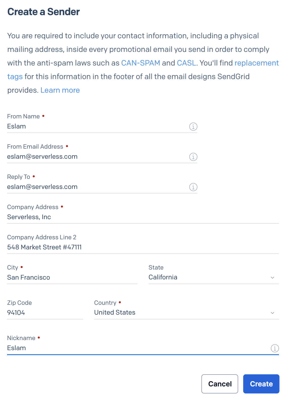To access the SendGrid API, you will need a SendGrid API Key. You can create one in the SendGrid dashboard. You’ll also need to verify the email address you will be using to send emails on the SendGrid dashboard, otherwise SendGrid will reject all your API requests. As you can see below, it requires a little bit of typing to comply with anti-spam laws, but once you’re done, you don’t have to worry about it again. We’re using our mailing address for demonstration, which is found on our website anyway, but you’ll need to add your own mailing address.
